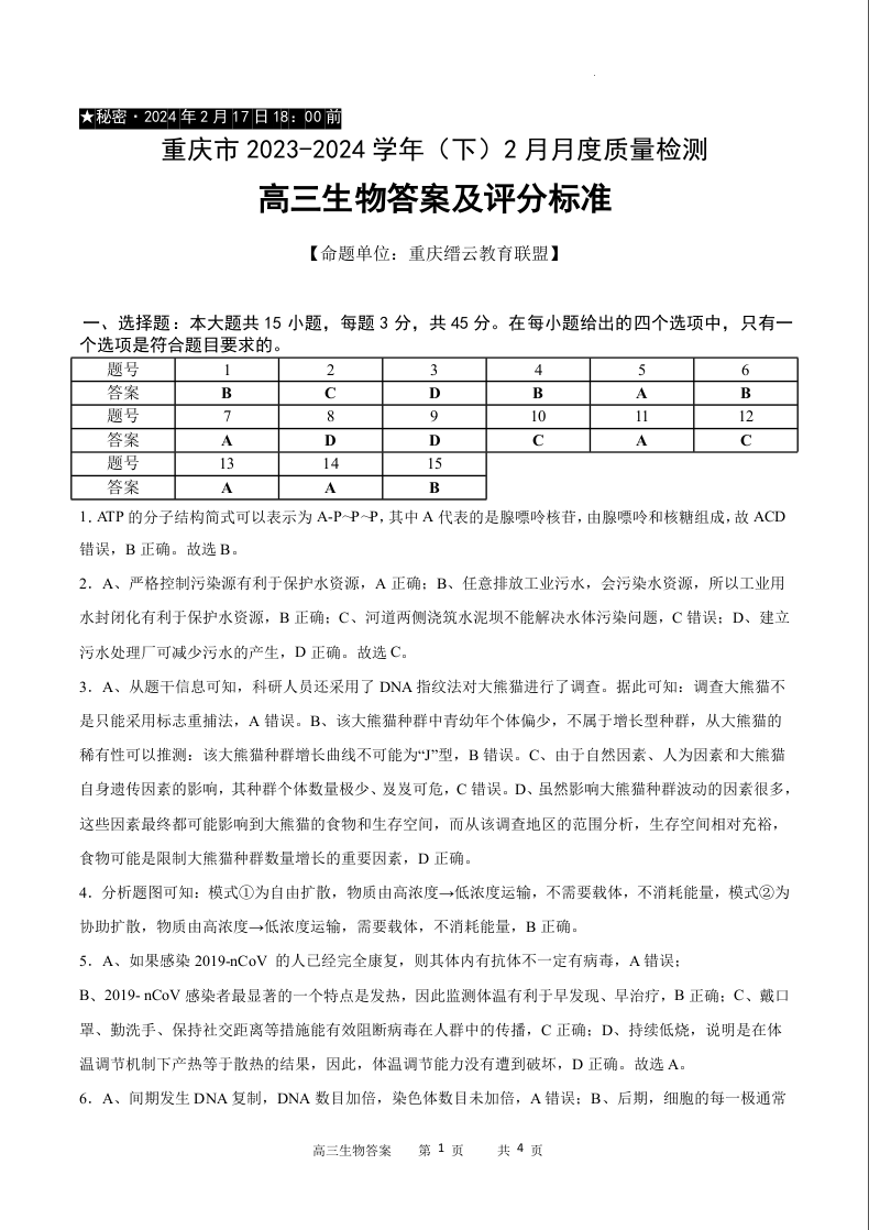 重庆市缙云教育联盟2024届高三下学期2月月度质量检测生物答案