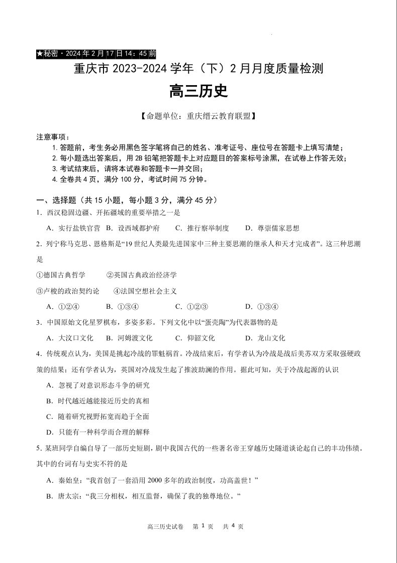 重庆市缙云教育联盟2024届高三下学期2月月度质量检测历史