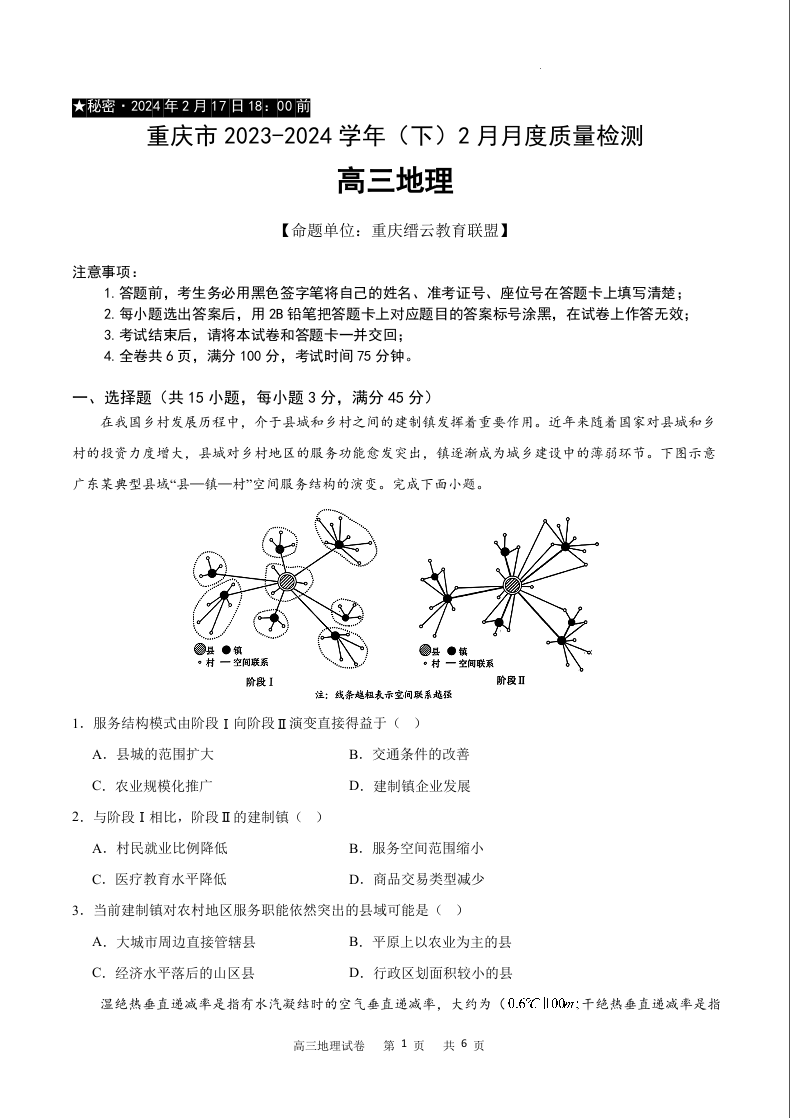 重庆市缙云教育联盟2024届高三下学期2月月度质量检测地理