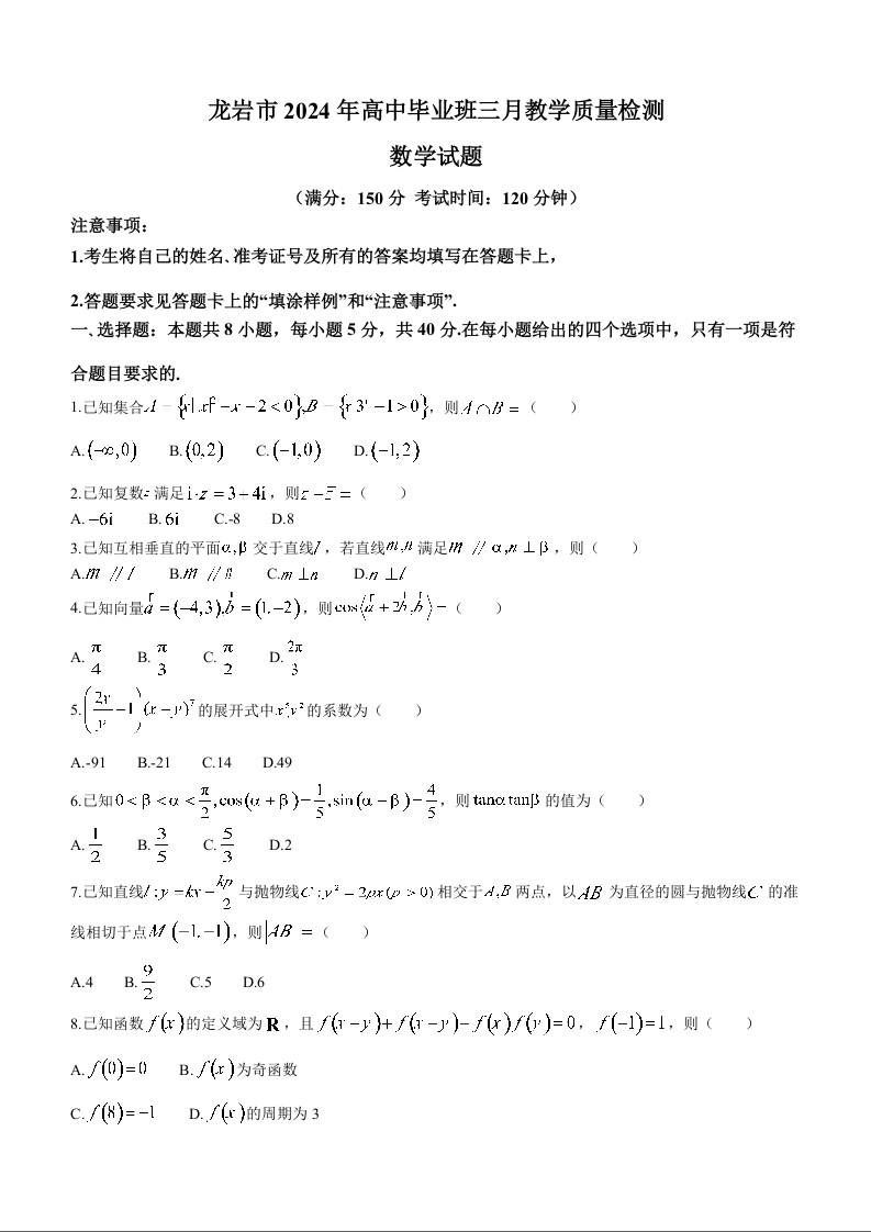福建省龙岩市2024届高三下学期3月份质量检测一模数学