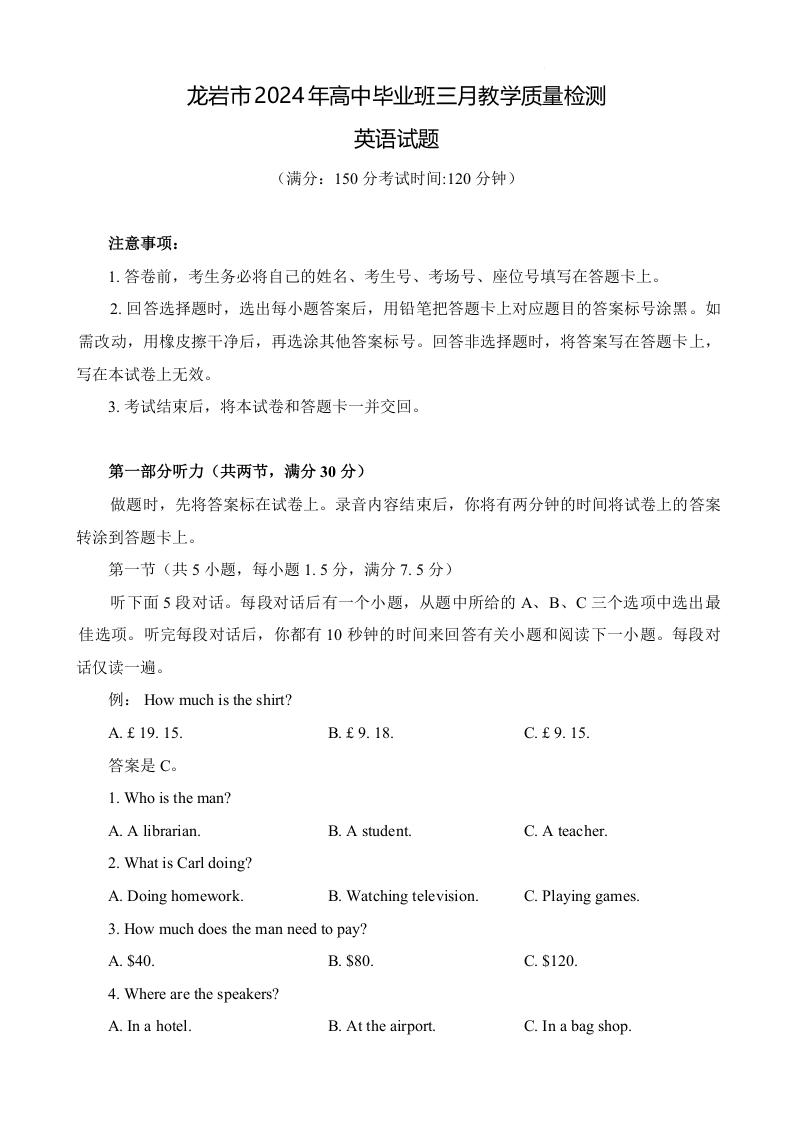 福建省龙岩市2024届高三下学期3月份质量检测一模英语