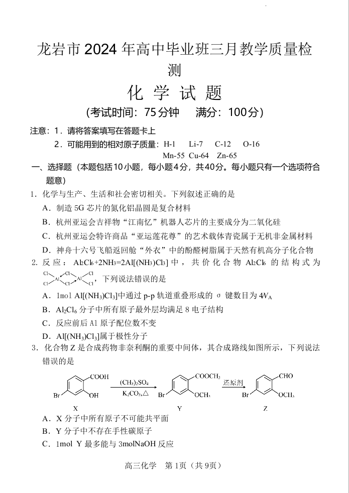 福建省龙岩市2024届高三下学期3月份质量检测一模化学