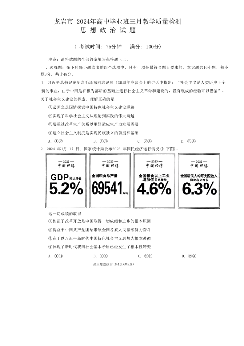 福建省龙岩市2024届高三下学期3月份质量检测一模政治+答案