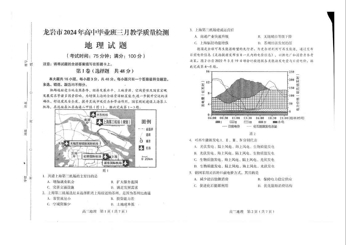 2024届福建省龙岩市高三下学期3月份质量检测一模地理+答案