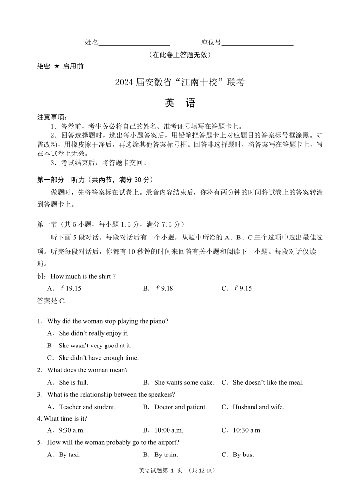安徽省2024届“江南十校”高三3月联考(一模)英语