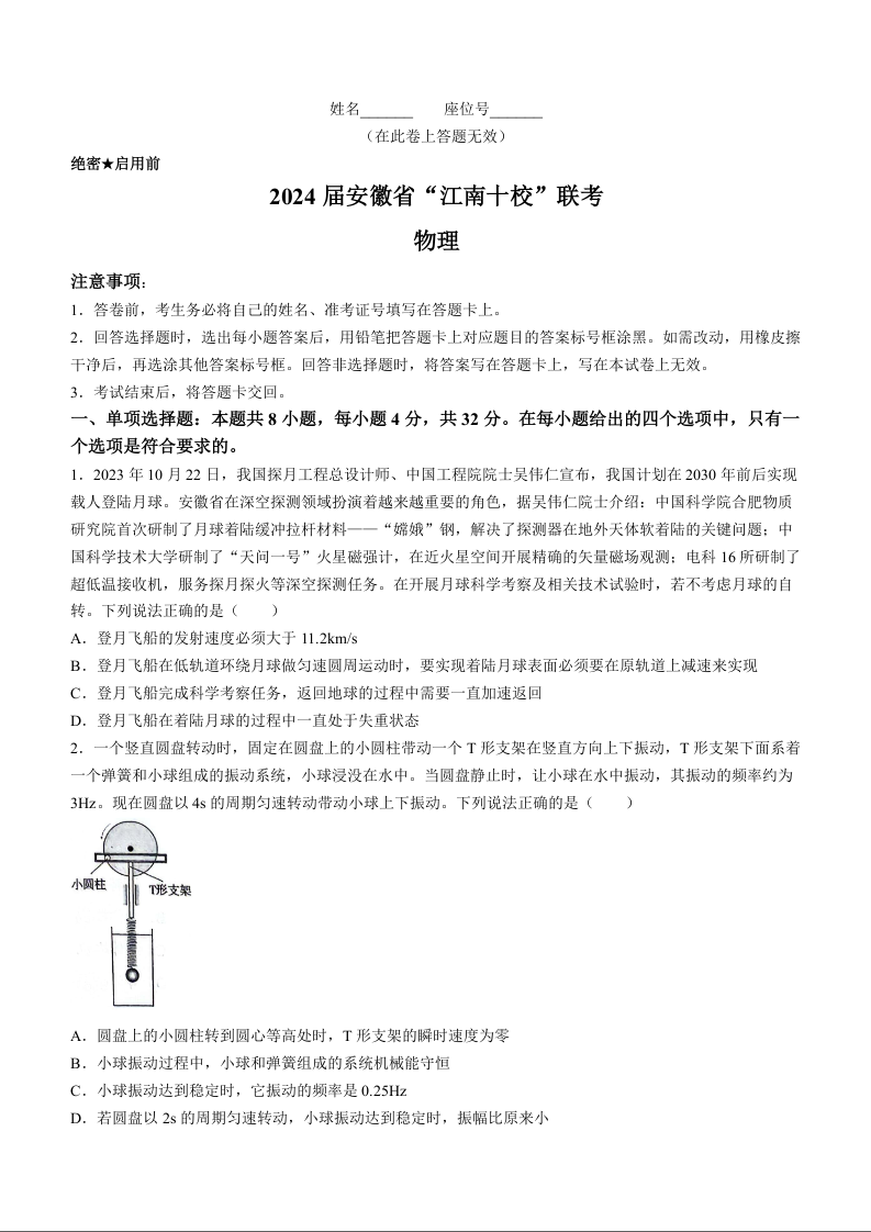 安徽省2024届“江南十校”高三3月联考(一模)物理