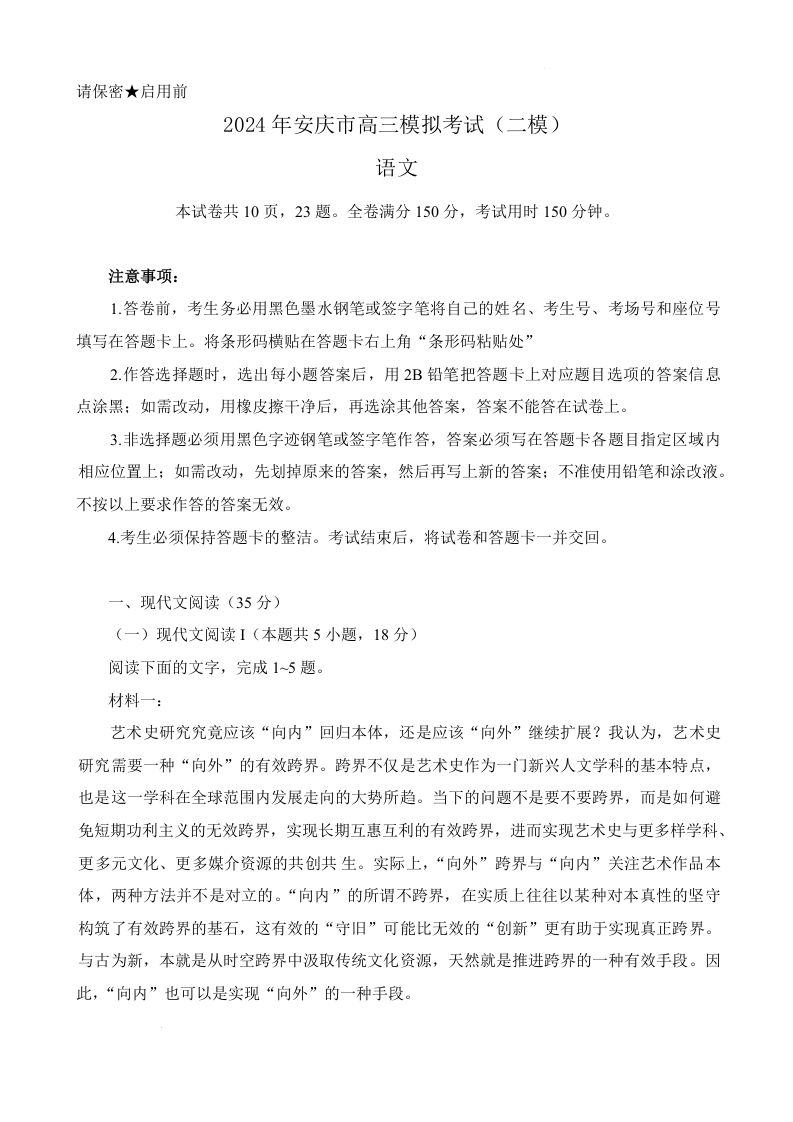 安徽省安庆市2024年高三下学期3月模拟考试(安庆二模)语文