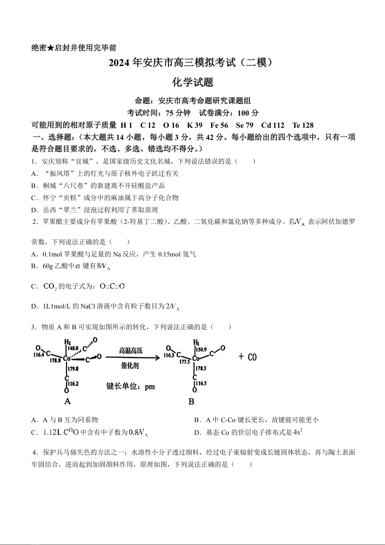 安徽省安庆市2024年高三下学期3月模拟考试(安庆二模)化学