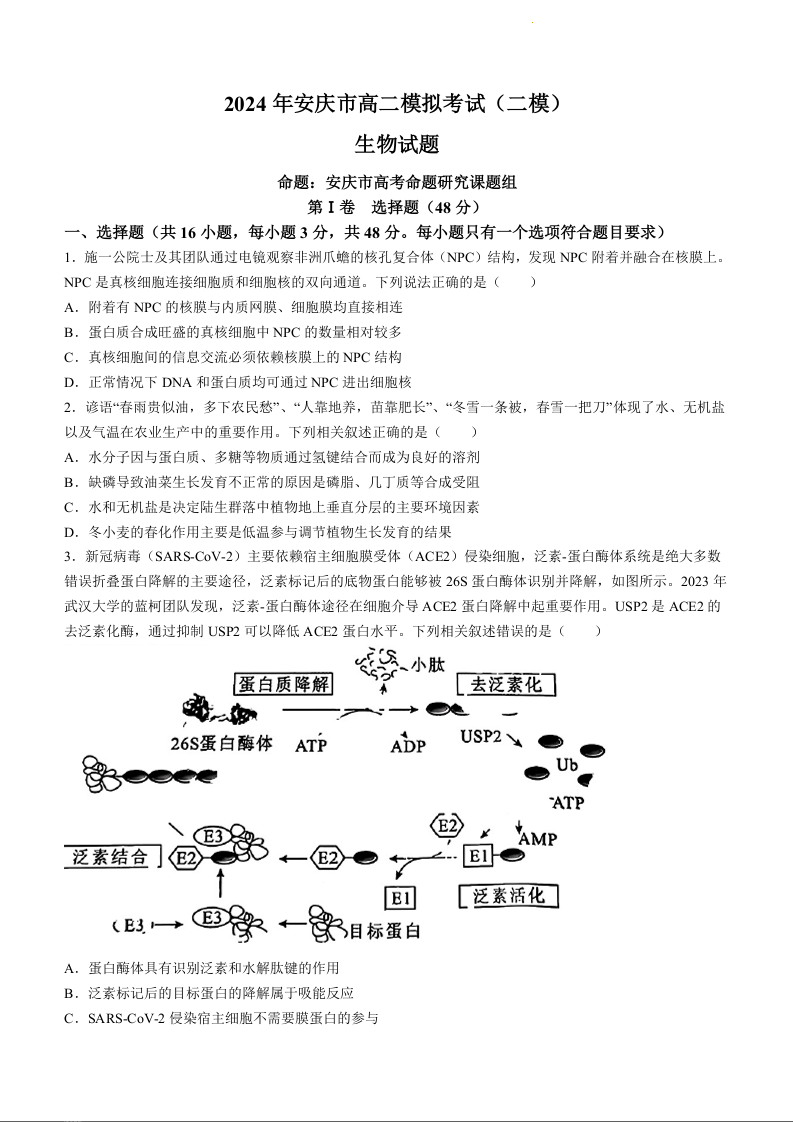 安徽省安庆市2024年高三下学期3月模拟考试(安庆二模)生物