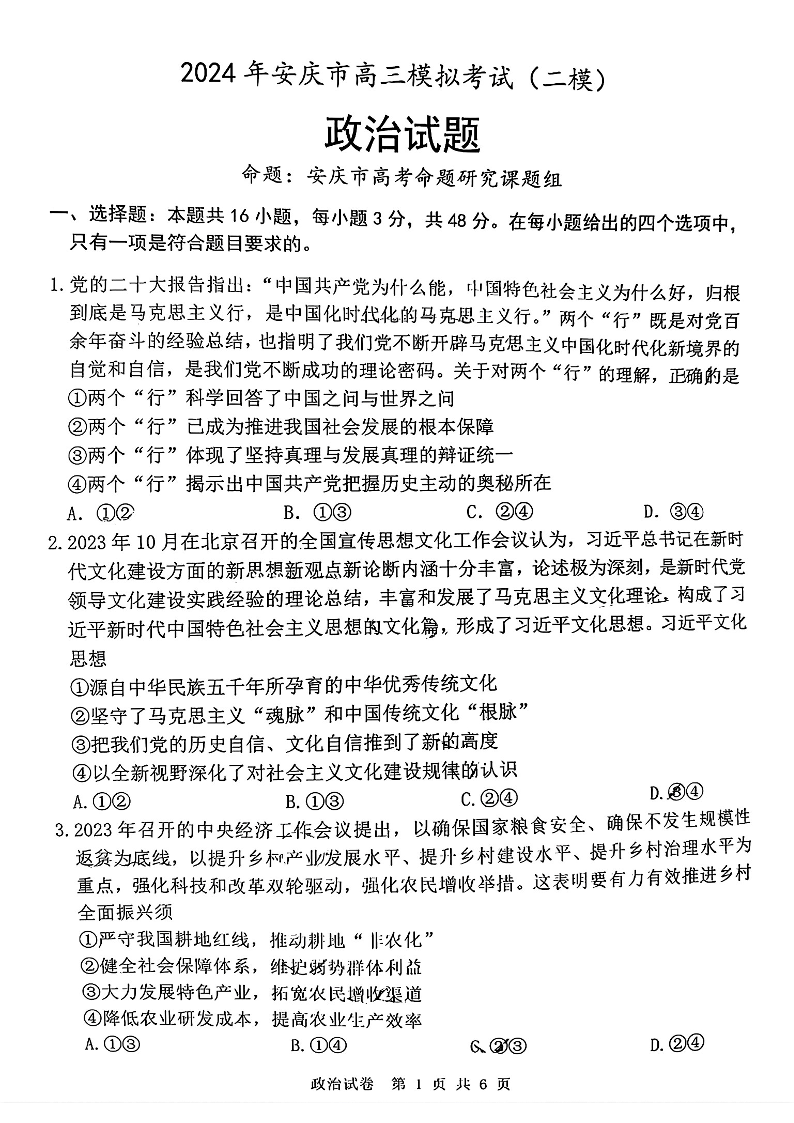 安徽省安庆市2024年高三下学期3月模拟考试(安庆二模)政治+答案