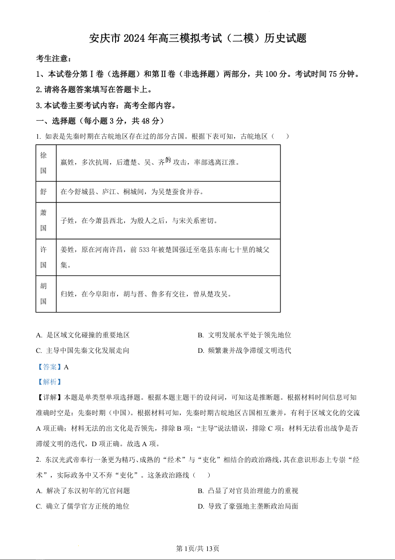安徽省安庆市2024年高三下学期3月模拟考试(安庆二模)历史(精品解析版)