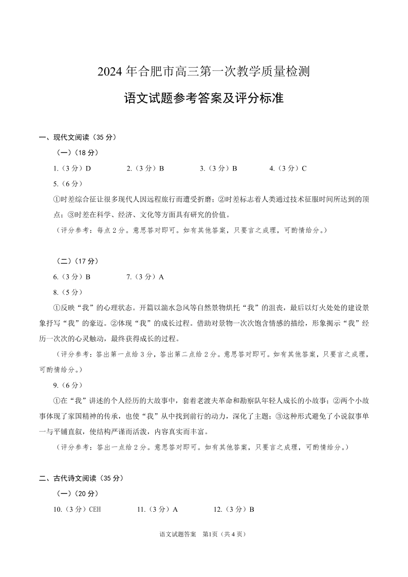 安徽省合肥市2024届高三第一次教学质量检查语文答案