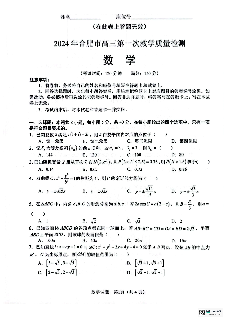 安徽省合肥市2024届高三第一次教学质量检查数学