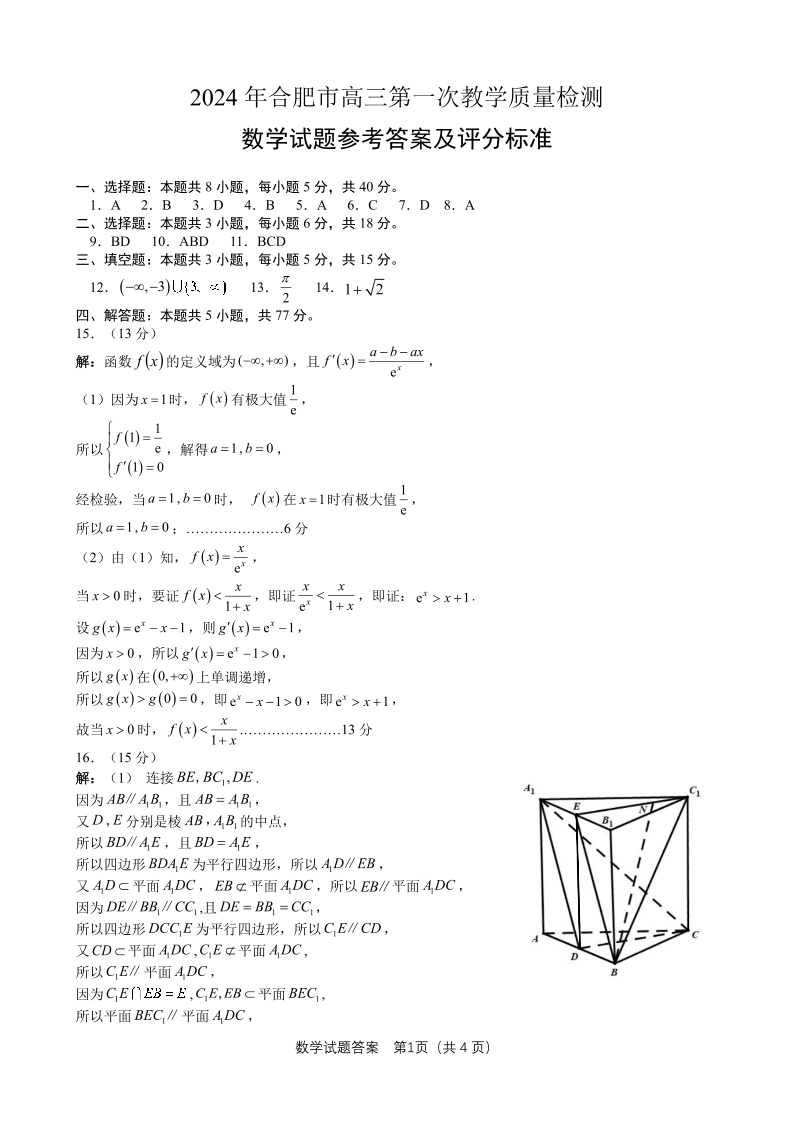 安徽省合肥市2024届高三第一次教学质量检查数学答案