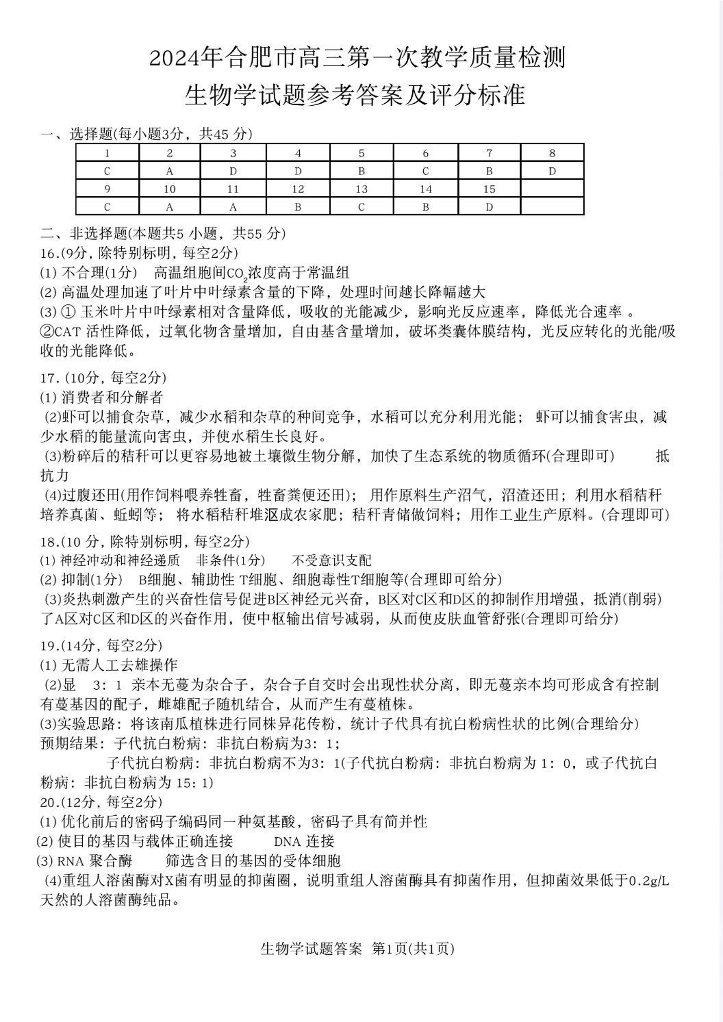 安徽省合肥市2024届高三第一次教学质量检查生物答案