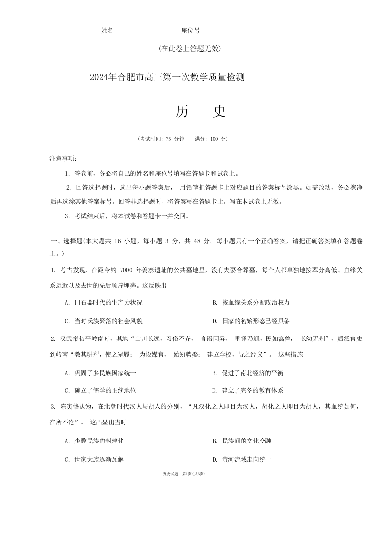 安徽省合肥市2024届高三第一次教学质量检查历史+答案