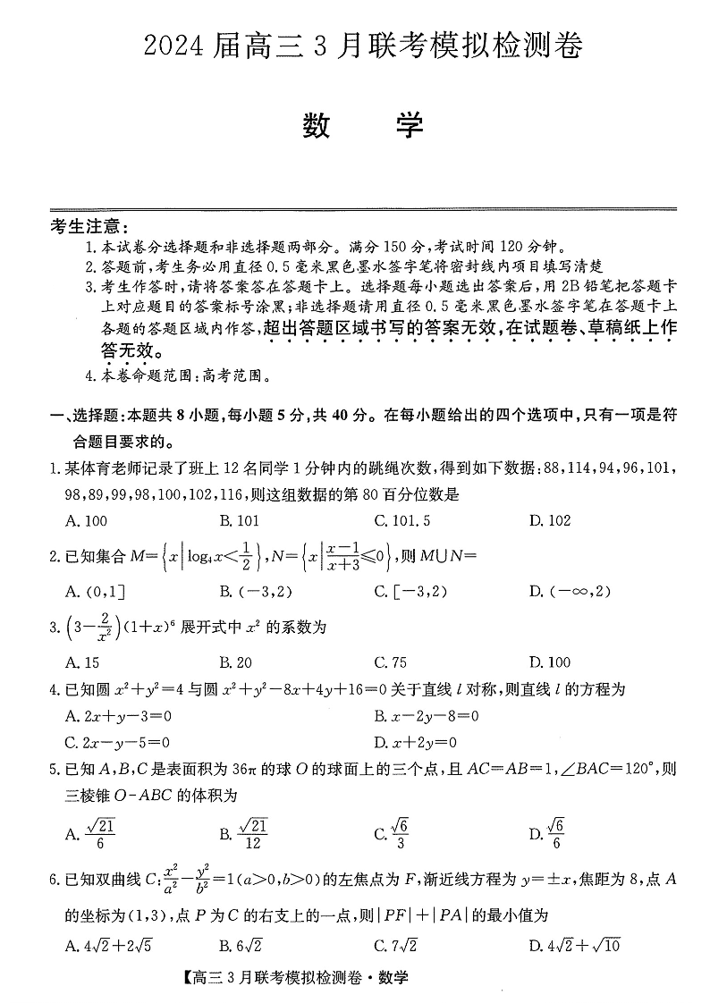 东北三省2024届高三3月联考模拟检测卷数学+答案