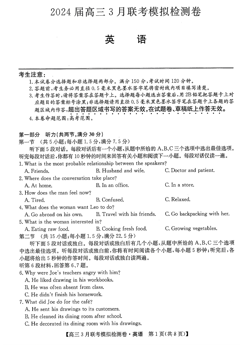 东北三省2024届高三3月联考模拟检测卷英语+答案
