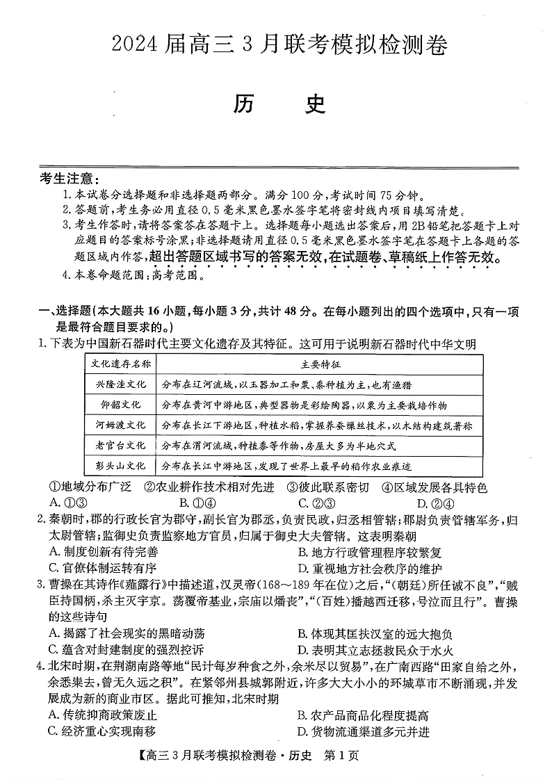 东北三省2024届高三3月联考模拟检测卷历史+答案