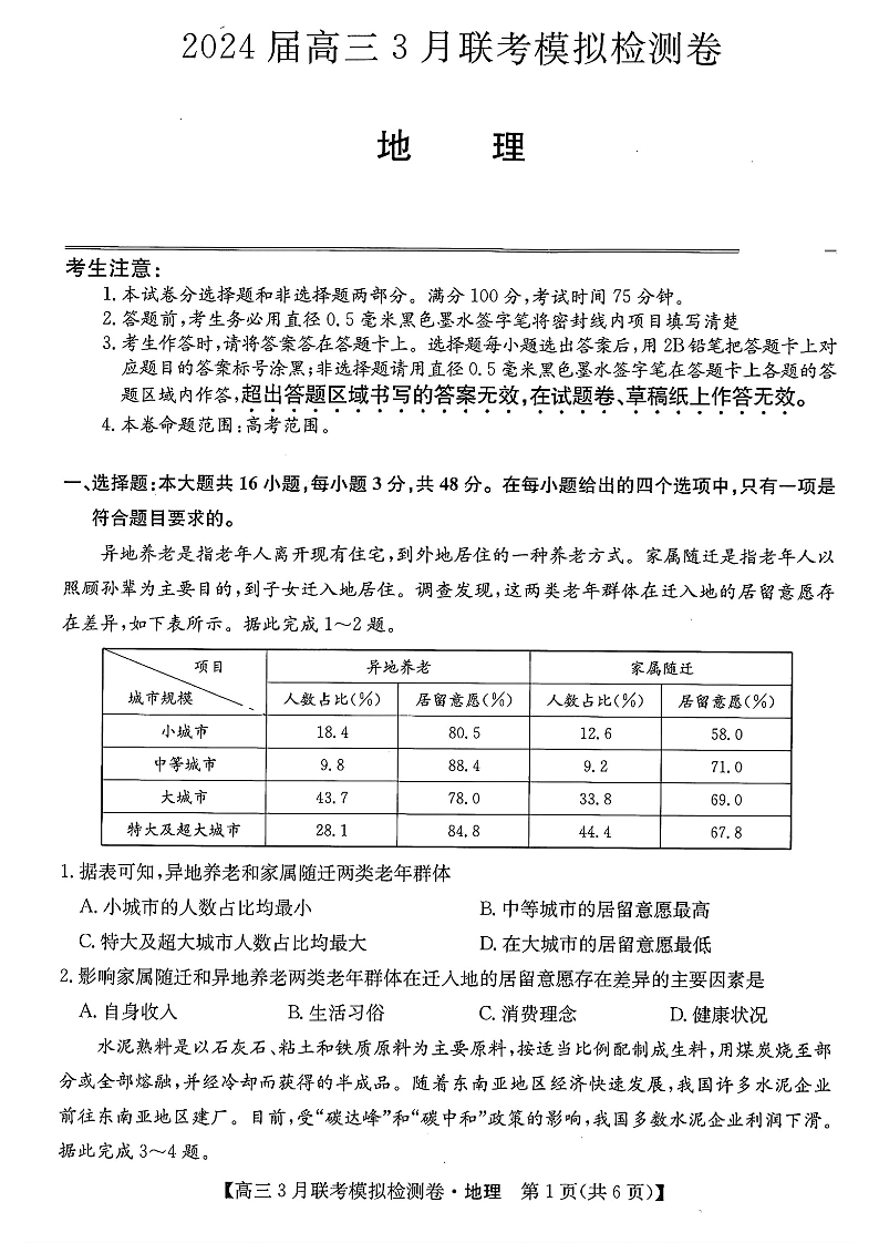 东北三省2024届高三3月联考模拟检测卷地理