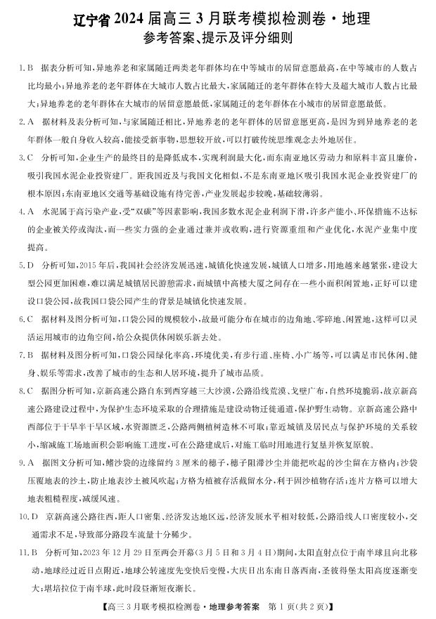 东北三省2024届高三3月联考模拟检测卷地理答案