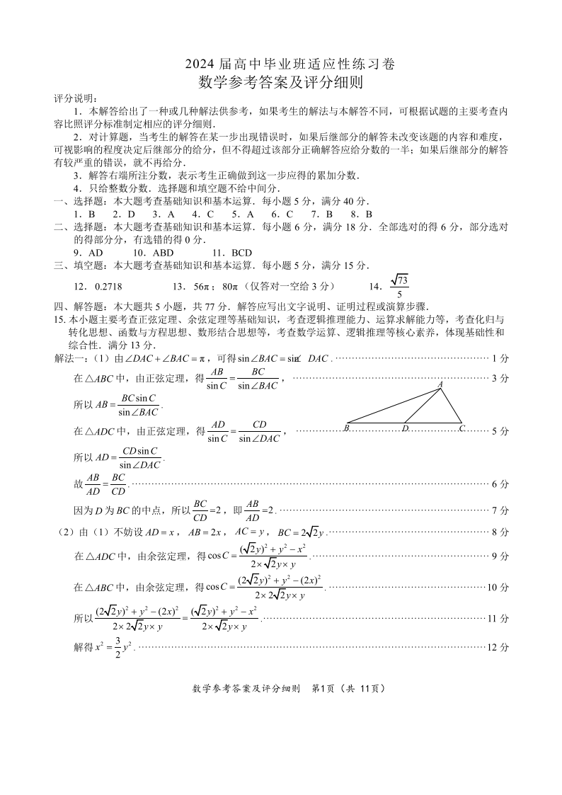 福建省三明市2024届高三下学期3月质检(一模)数学答案