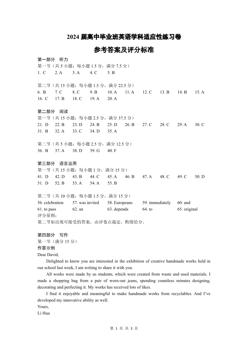 福建省三明市2024届高三下学期3月质检(一模)英语答案