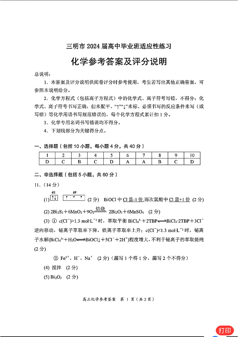 福建省三明市2024届高三下学期3月质检(一模)化学答案