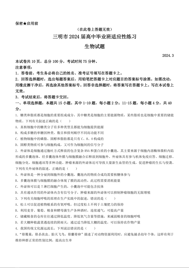 福建省三明市2024届高三下学期3月质检(一模)生物