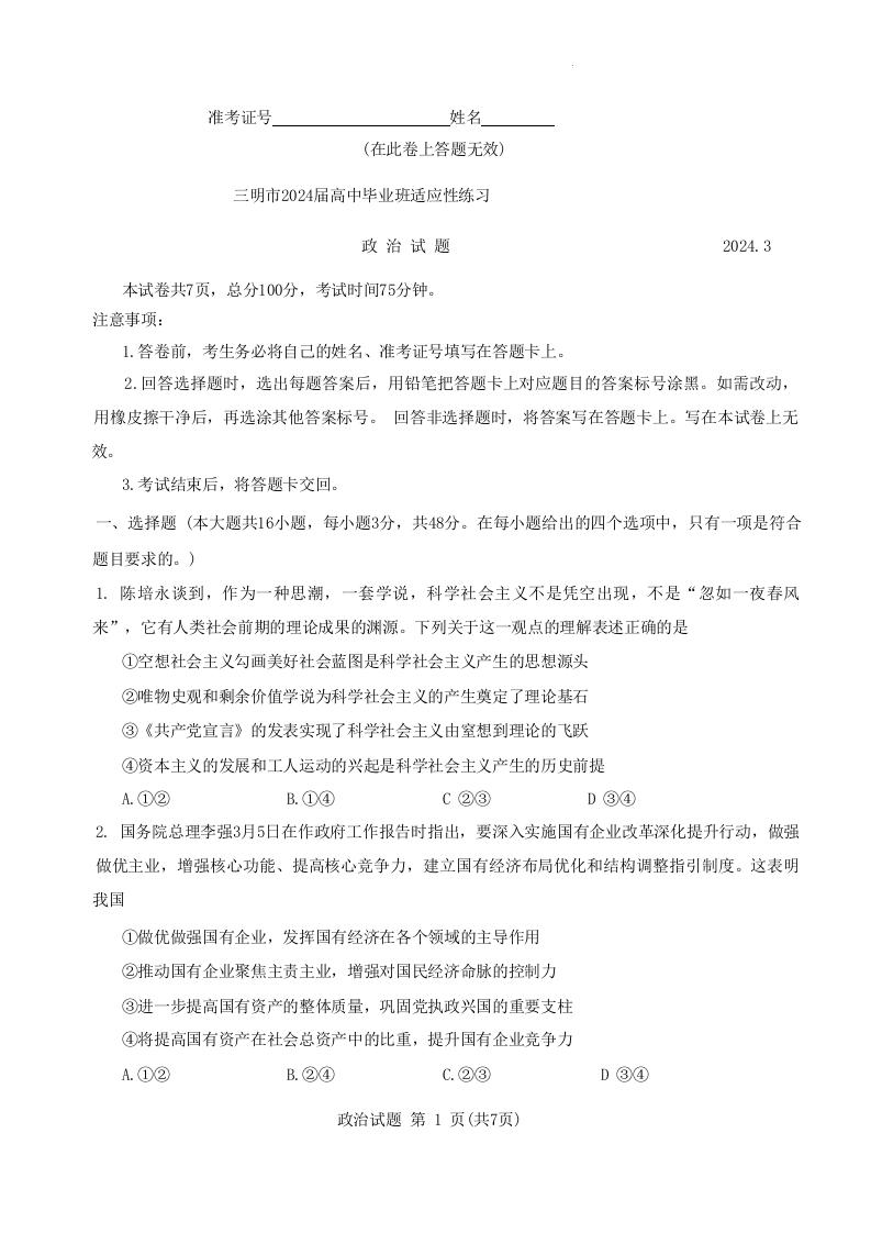 福建省三明市2024届高三下学期3月质检(一模)政治+答案