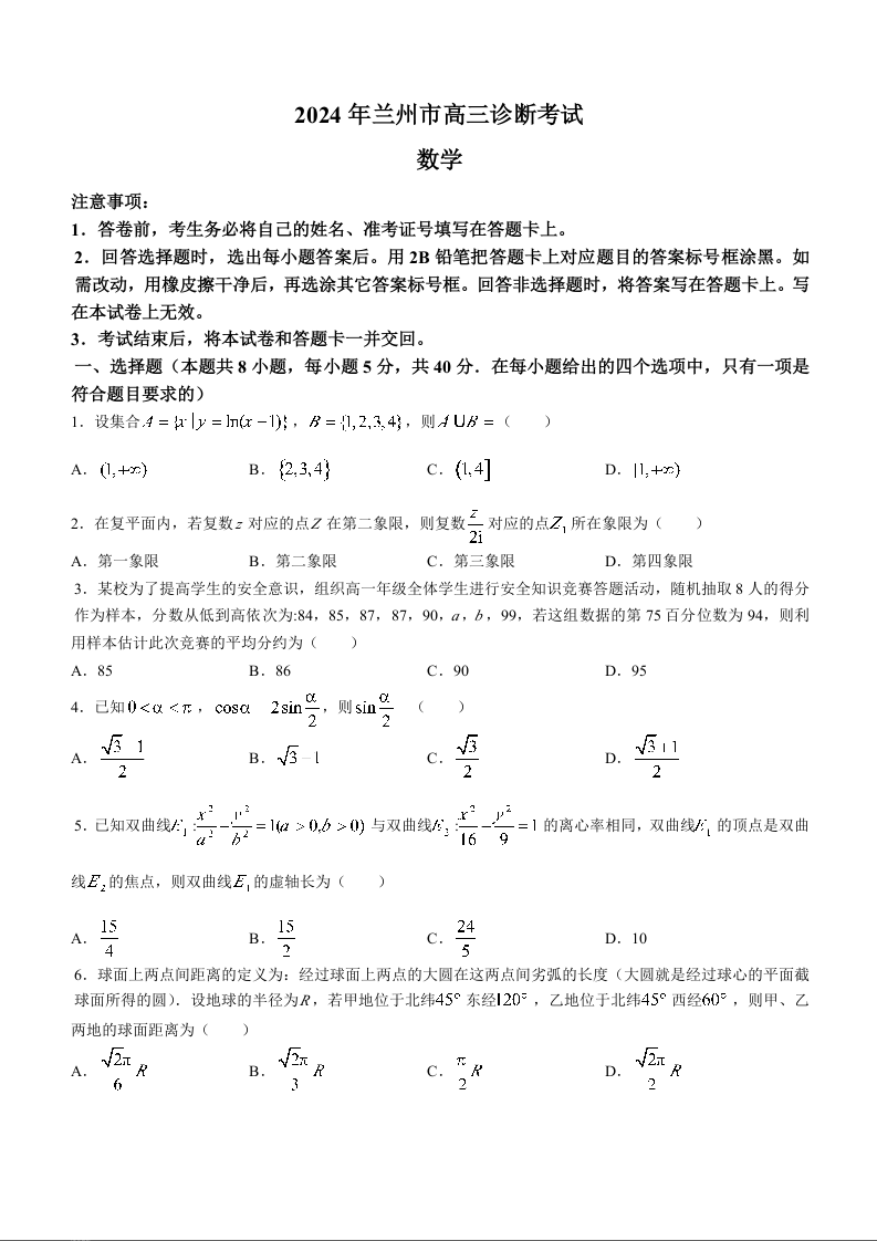 甘肃省兰州市2024届高三下学期诊断考试(兰州一模)数学