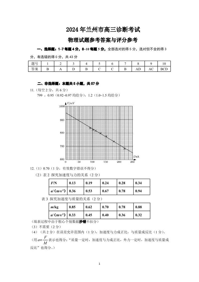 甘肃省兰州市2024届高三下学期诊断考试(兰州一模)物理答案