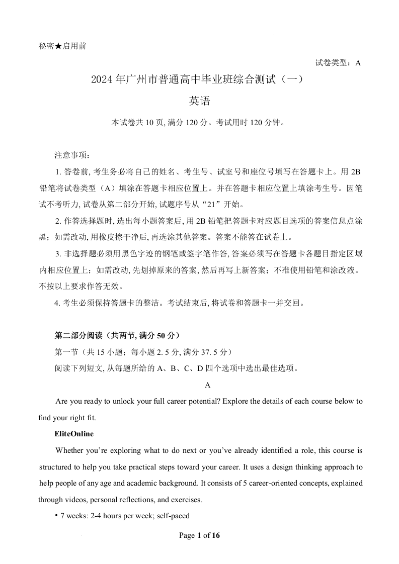 广东省广州市2024届普通高中毕业班下学期一模考试(广州一模)英语+答案