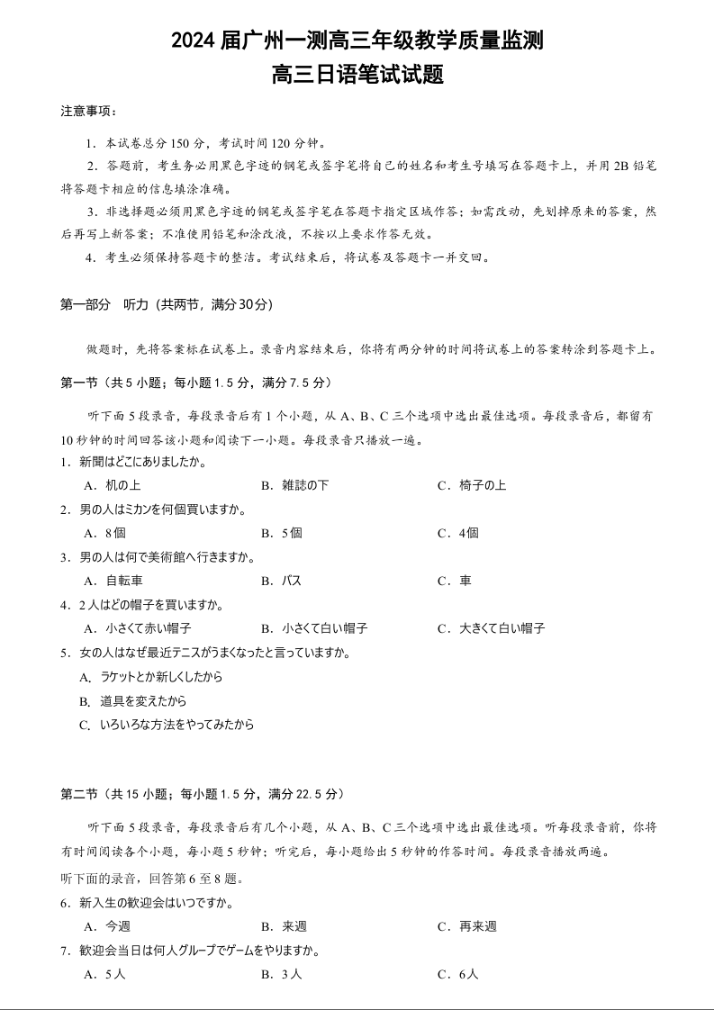 广东省广州市2024届普通高中毕业班下学期一模考试(广州一模)日语