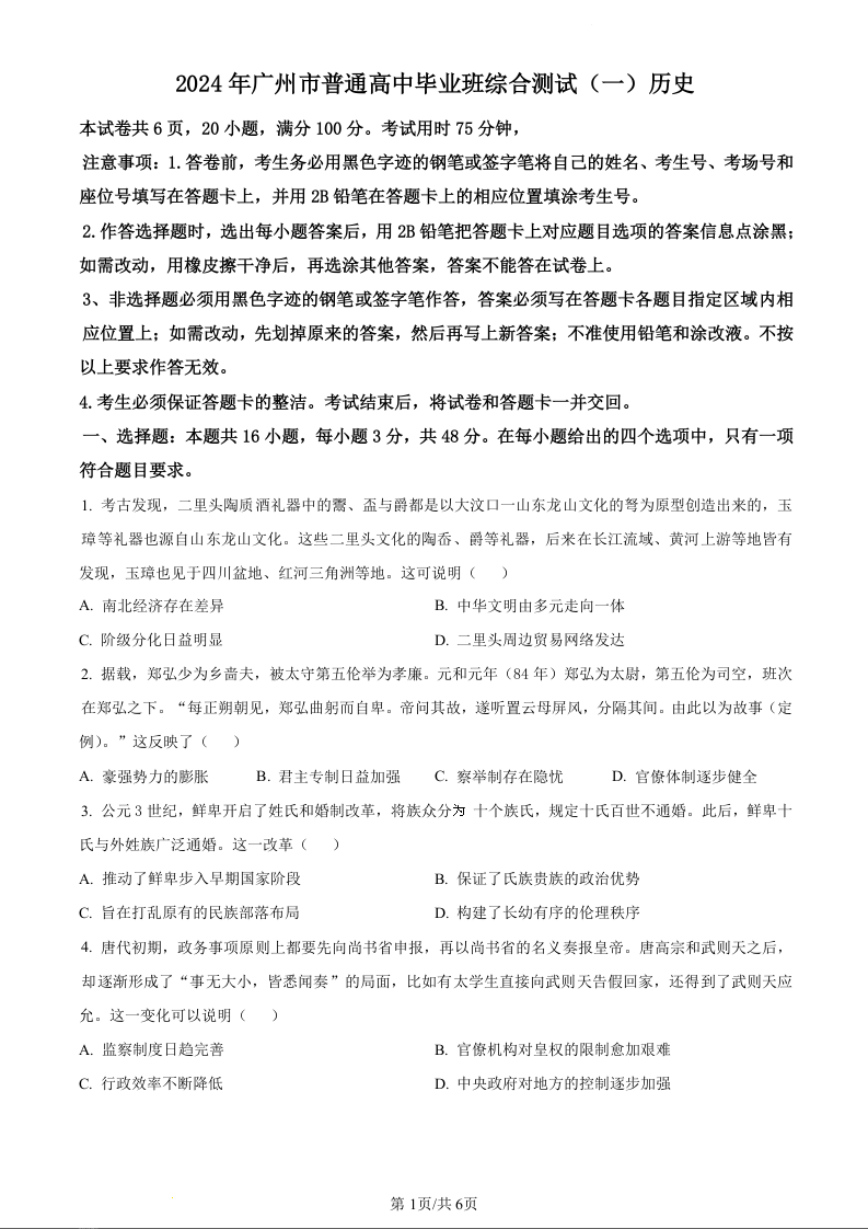 广东省广州市2024届普通高中毕业班下学期一模考试(广州一模)历史(原卷版)