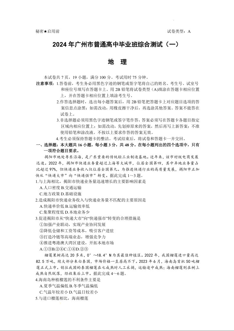 广东省广州市2024届普通高中毕业班下学期一模考试(广州一模)地理
