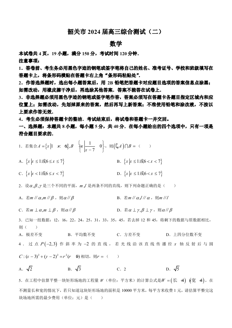 广东省韶关市2024届高三下学期综合测试(二)(韶关二模)数学