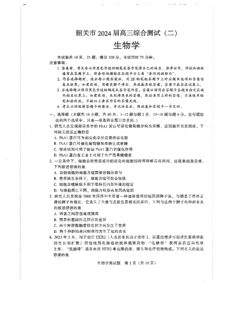 广东省韶关市2024届高三下学期综合测试(二)(韶关二模)生物
