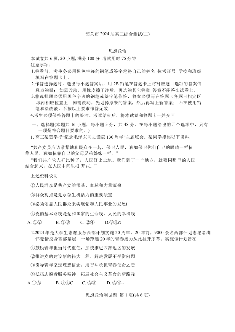 广东省韶关市2024届高三下学期综合测试(二)(韶关二模)政治