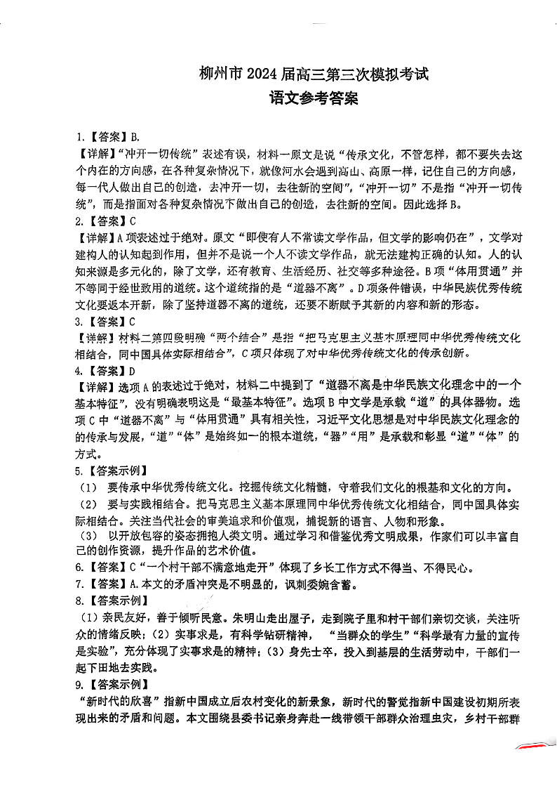 广西柳州市2024届高三下学期第三次模拟考试(柳州三模)语文答案