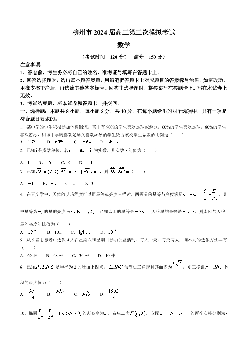 广西柳州市2024届高三下学期第三次模拟考试(柳州三模)数学+答案