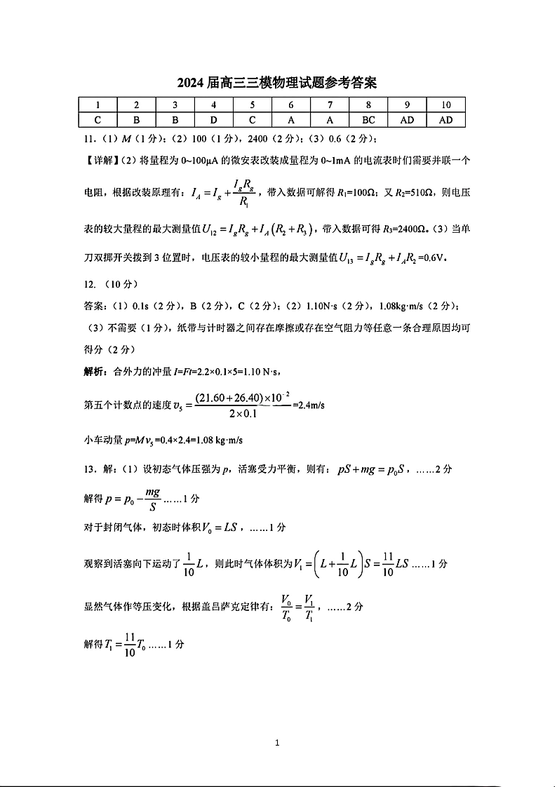 广西柳州市2024届高三下学期第三次模拟考试(柳州三模)物理答案