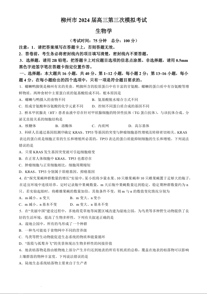 广西柳州市2024届高三下学期第三次模拟考试(柳州三模)生物+答案