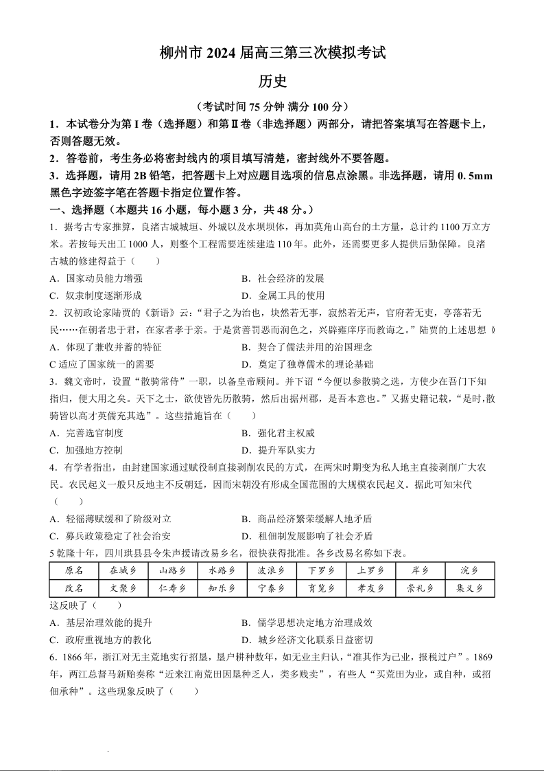 广西柳州市2024届高三下学期第三次模拟考试(柳州三模)历史