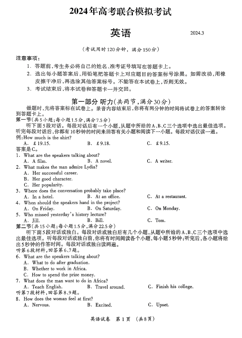 广西壮族自治区2024届高三3月联合模拟考试英语