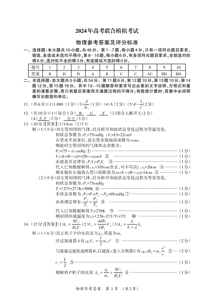 广西壮族自治区2024届高三3月联合模拟考试物理答案