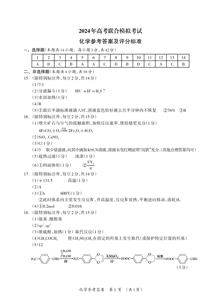 广西壮族自治区2024届高三3月联合模拟考试化学答案