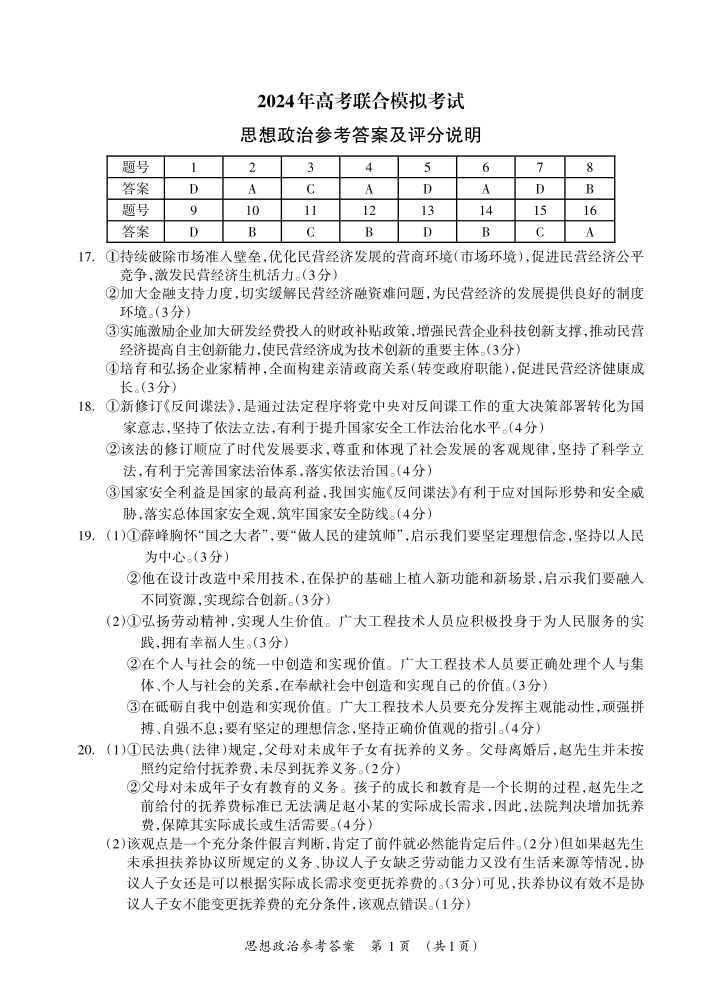 广西壮族自治区2024届高三3月联合模拟考试政治答案