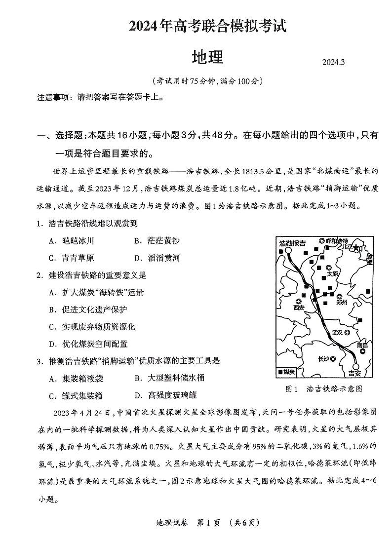 广西壮族自治区2024届高三3月联合模拟考试地理