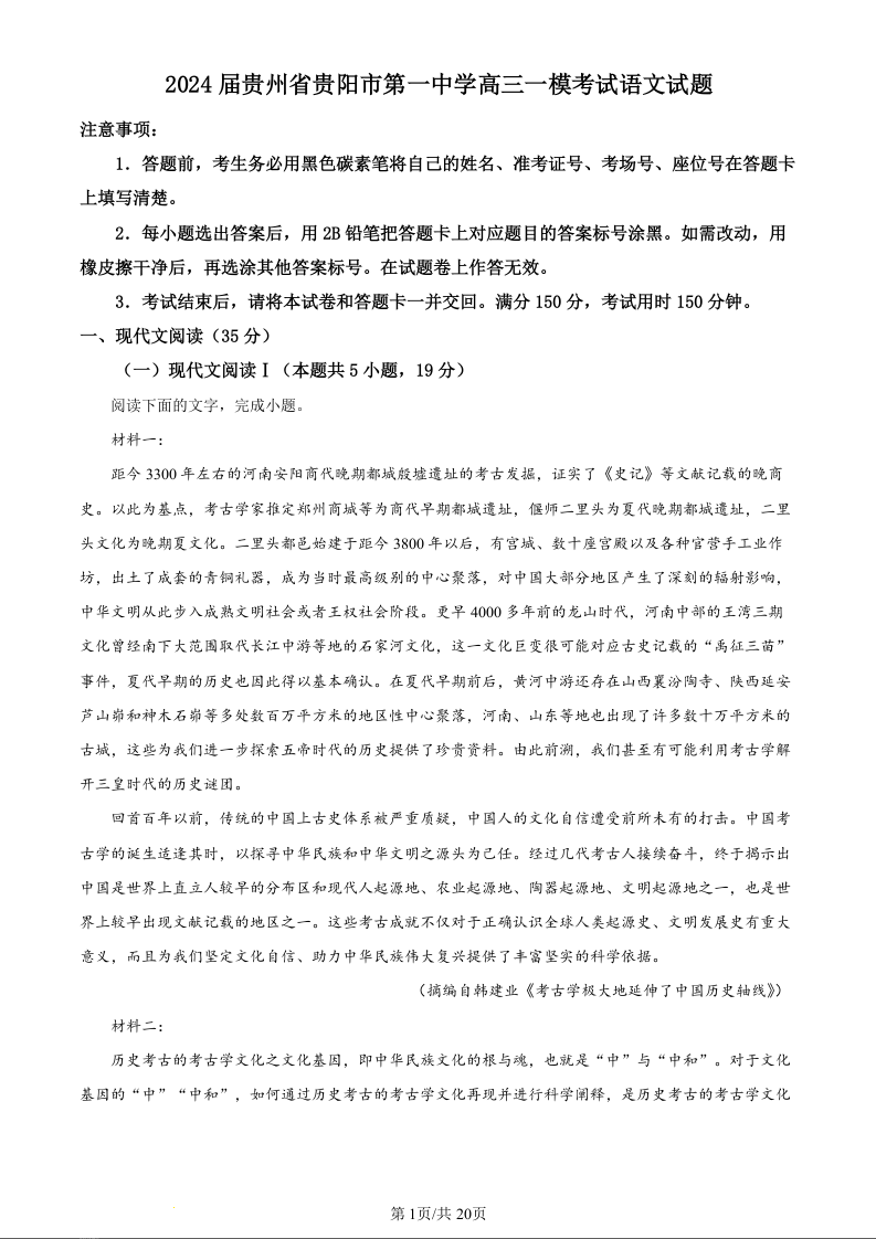 贵州省贵阳市第一中学2024届高三下学期一模考试语文(精品解析版)